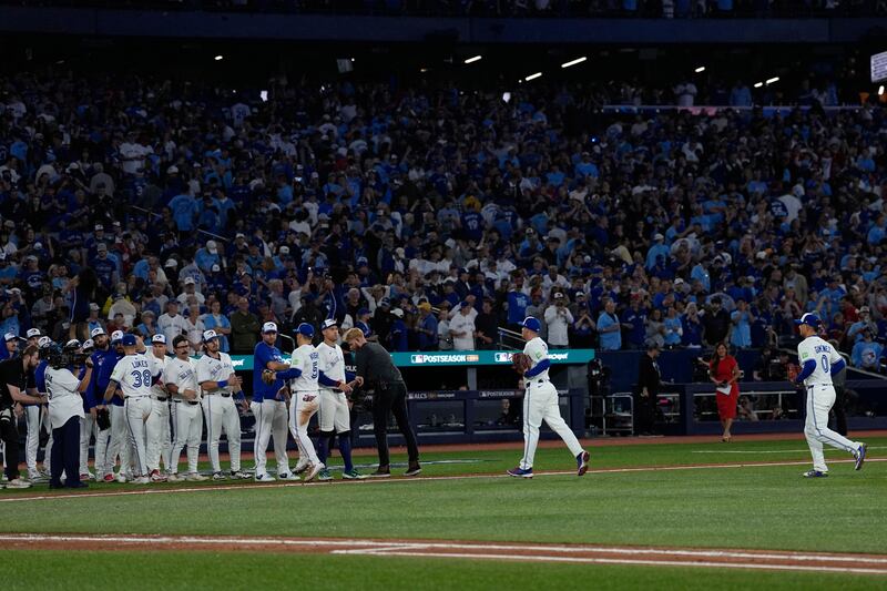 Blue Jays players run to congratulate Hoffman The Toronto Blue Jays celebrate after Game 7 of baseball's American League Championship Series against the Seattle Mariners, Monday, Oct. 20, 2025, in Toronto.=
