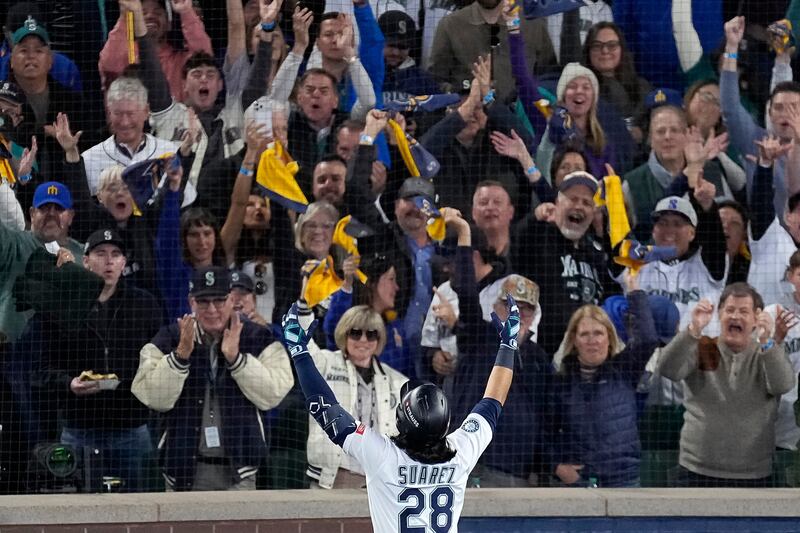 Suárez gets Mariners on the board first Seattle Mariners' Eugenio Suárez celebrates his solo home run against the Toronto Blue Jays during the second inning in Game 5 of baseball's American League Championship Series, Friday, Oct. 17, 2025, in Seattle.