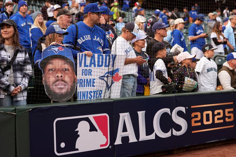 Fans arrive for Game 1 Fans arrive prior to Game 1 of baseball's American League Championship Series between the Toronto Blue Jays and the Seattle Mariners, Sunday, Oct. 12, 2025, in Toronto. (AP Photo/David J. Phillip)