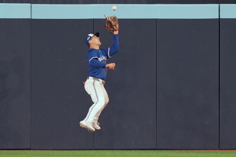 Blue Jays vs Yankees Toronto Blue Jays centre fielder Daulton Varsho (5) makes a catch against the New York Yankees during the eighth inning of game 1 in MLB American League Division Series baseball action in Toronto on Saturday, October 4, 2025. THE CANADIAN PRESS/Nathan Denette