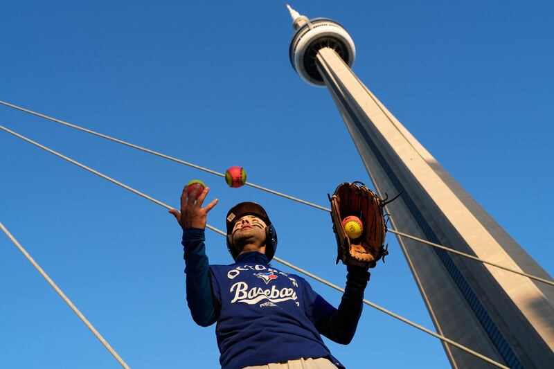 Toronto gears up for Game 1 Cesar Agular tosses a baseball outside the stadium prior to Game 1 of baseball's American League Championship Series between the Toronto Blue Jays and the Seattle Mariners, Sunday, Oct. 12, 2025, in Toronto. (AP Photo/David J. Phillip)