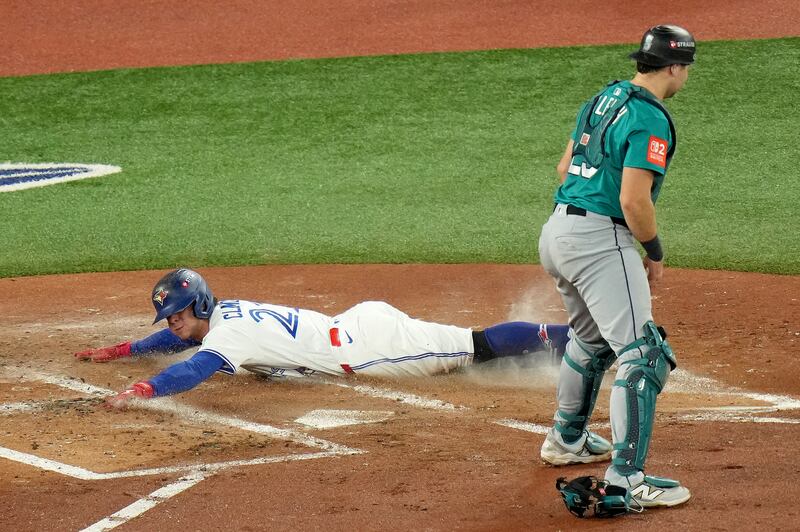 Clement slides home Seattle Mariners catcher Cal Raleigh (29) looks on as Toronto Blue Jays third base Ernie Clement (22) scores on a single by teammate Isiah Kiner-Falefa (7) during second inning MLB American League Championship Series game 6 baseball action in Toronto, Sunday, Oct. 19, 2025.