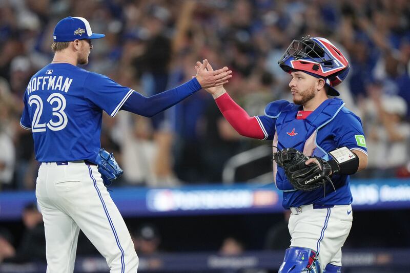 Blue Jays vs Yankees Toronto Blue Jays pitcher Jeff Hoffman (23) and catcher Alejandro Kirk (30) celebrate after defeating the New York Yankees in game 1 in MLB American League Division Series baseball action in Toronto on Saturday, October 4, 2025. THE CANADIAN PRESS/Nathan Denette