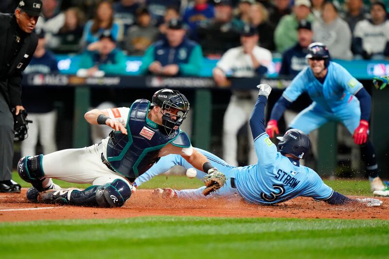 Straw slides in for a long run Toronto Blue Jays outfielder Myles Straw (3) slides safe into home plate to score on a double by teammate Andres Gimenez, not shown, as Seattle Mariners catcher Cal Raleigh (29) fails to make the tag during eighth inning MLB American League Championship Series game 4 baseball action in Seattle, Thursday, Oct. 16, 2025.