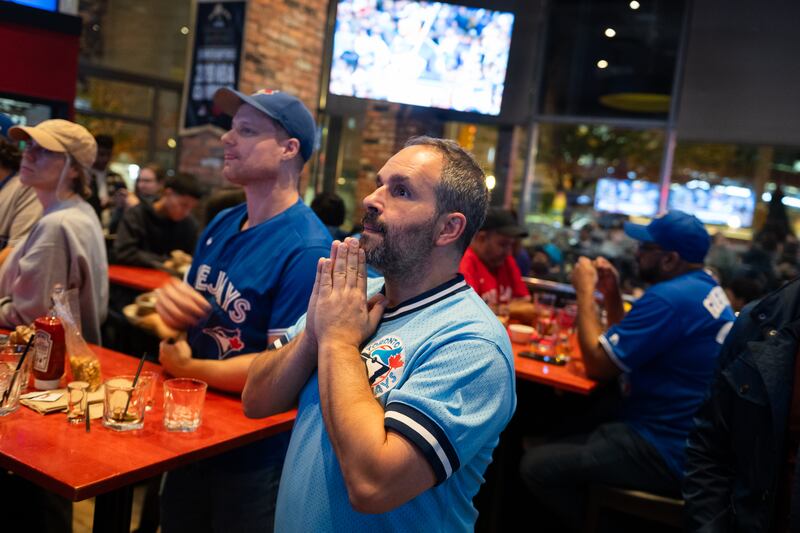 Blue Jays fans watch on nervously Toronto Blue Jays fans watch the team play against the Seattle Mariners for the American League Championship Series at the Rogers Centre in Toronto, Monday, Oct. 20, 2025. THE CANADIAN PRESS/Laura Proctor