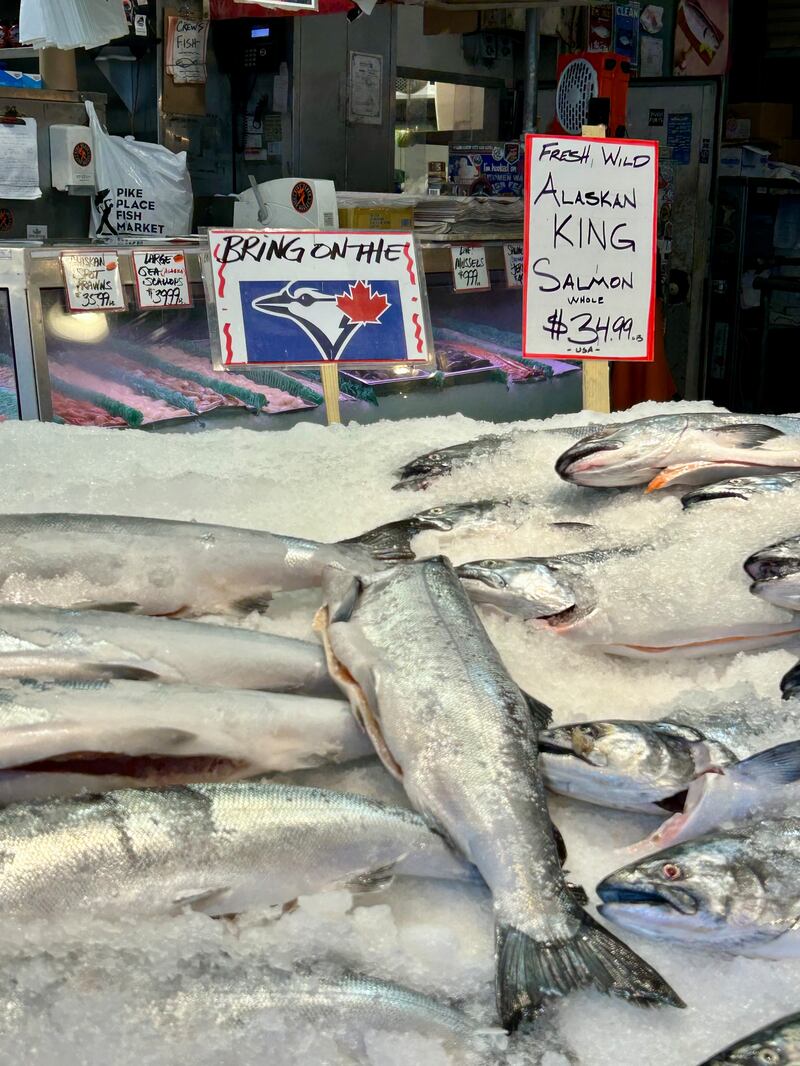 There was also a “bring on the Jays” sign stuck in among the salmon on display for sale.