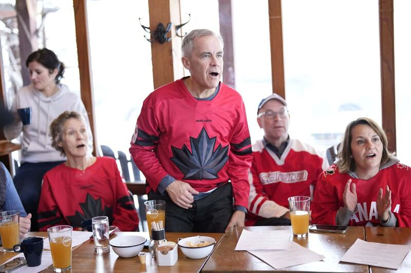 Carney and his wife, Diana Fox Carney, joined a gaggle of friends and family of the Prime Minister’s Office, Liberal MPs and restaurant staff at Quebec’s Chelsea Pub north of Ottawa shortly before 8 a.m., just ahead of the first faceoff.