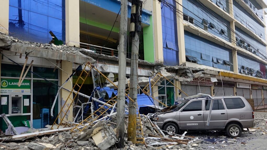 TV footage showed army troops and other rescuers pulling out the body of a man from the concrete rubble of a damaged house while relatives wept. In Surigao's downtown area, the facade of a number of buildings were heavily cracked, their glass windows shattered with canopies and debris falling on parked cars on the street below.