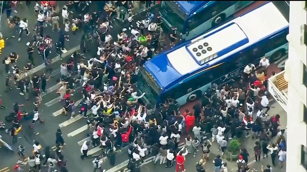 Aerial TV news footage showed a surging, tightly packed crowd running through the streets, scaling structures in the park and snarling traffic. Shouting teenagers swung objects at car windows, threw paint cans and set off fire extinguishers. Some people climbed on a moving vehicle, falling off as it sped away. Others pounded on or climbed atop city buses.