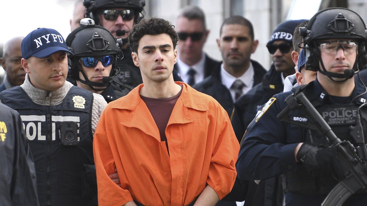 Shackled and wearing an orange prison jumpsuit, 26-year-old Luigi Mangione was escorted Thursday by a contingent of heavily armed police officers as he was whisked by plane and then helicopter from Pennsylvania to downtown Manhattan.