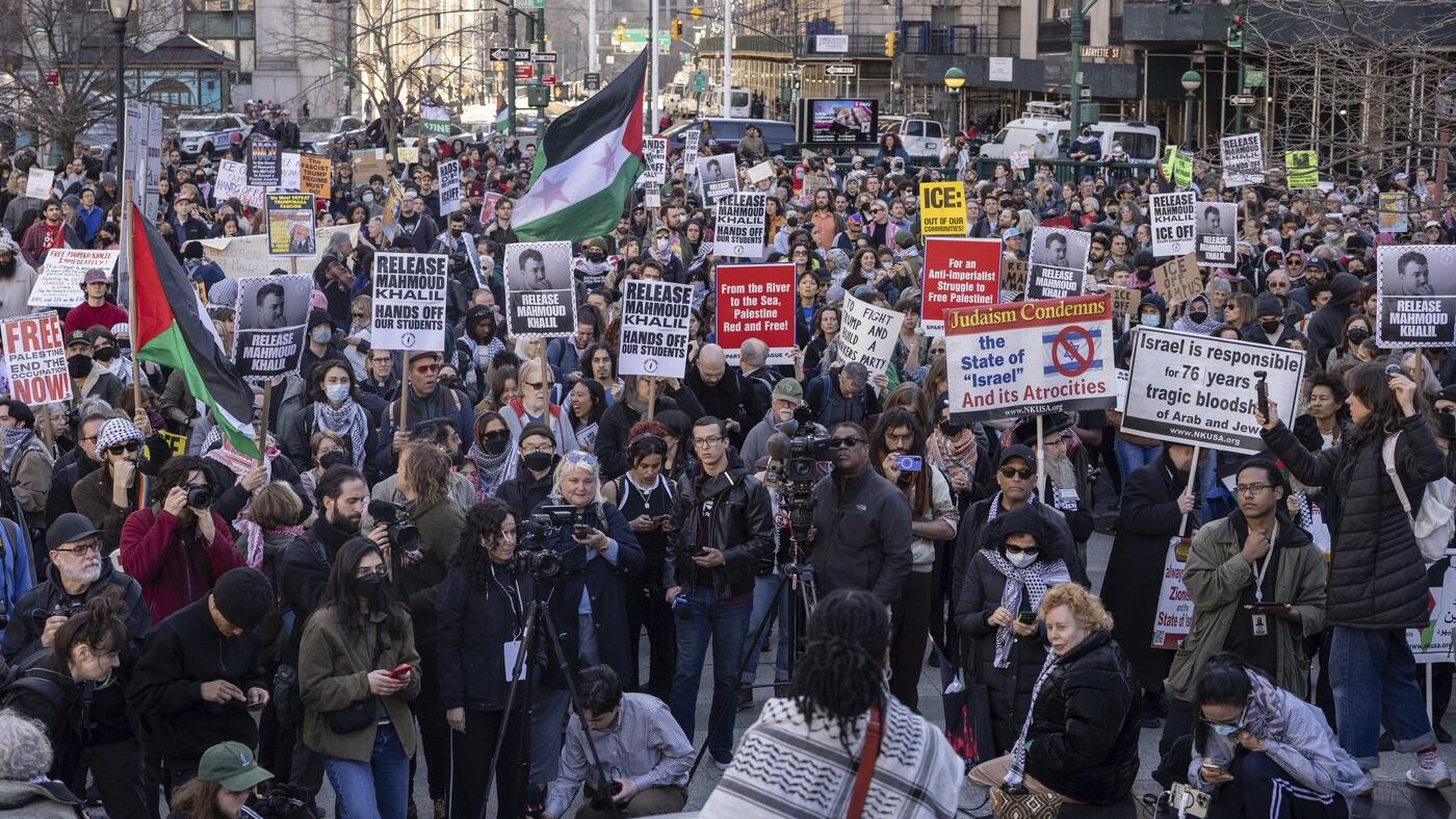 A few hundred protesters rallied near an Immigration and Customs Enforcement field office in Manhattan on Monday to demand Khalil’s release.