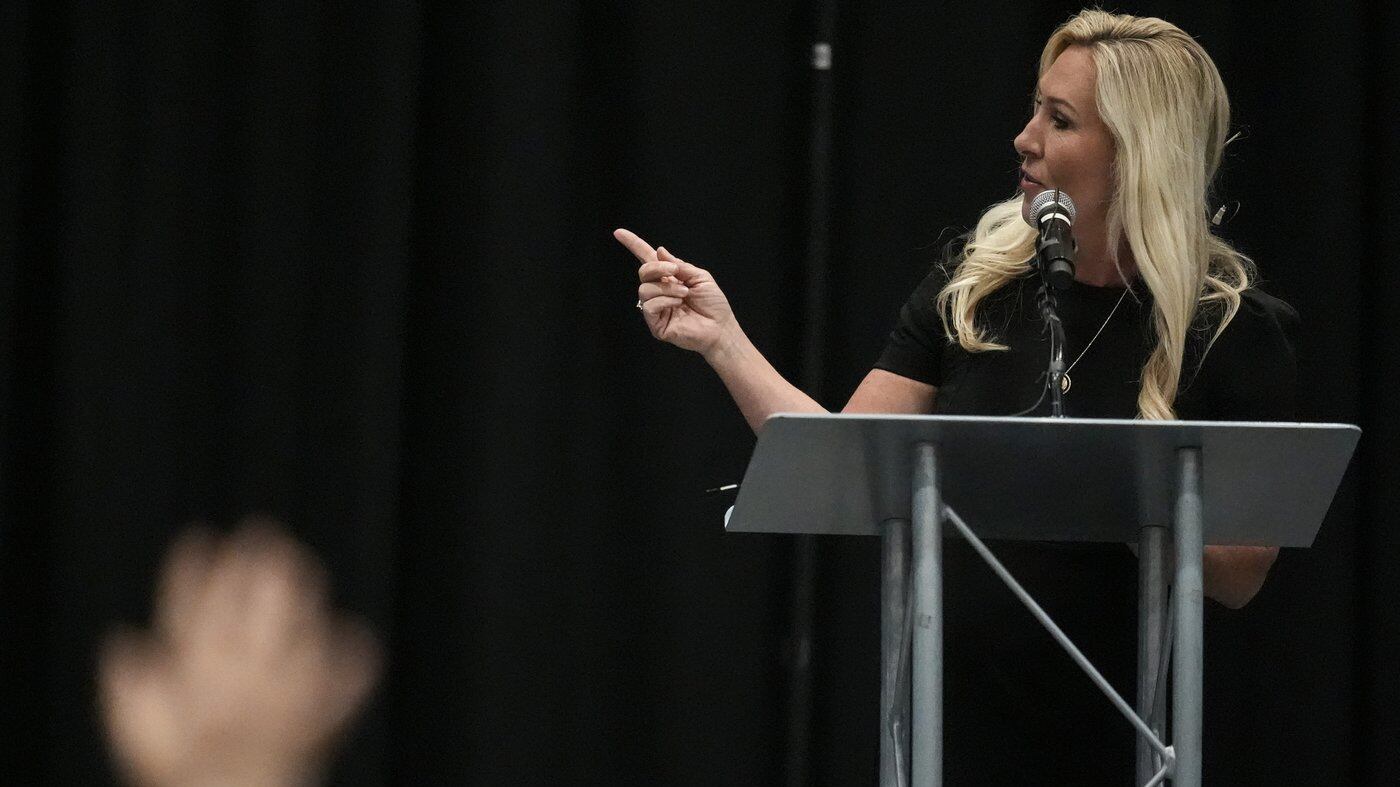 While Republican congressional leaders have advised their members not to hold town hall meetings, Greene has always courted the spotlight. After giving a speech and playing video clips of her supporting Trump, she answered questions that had been submitted in advance and printed on slides.