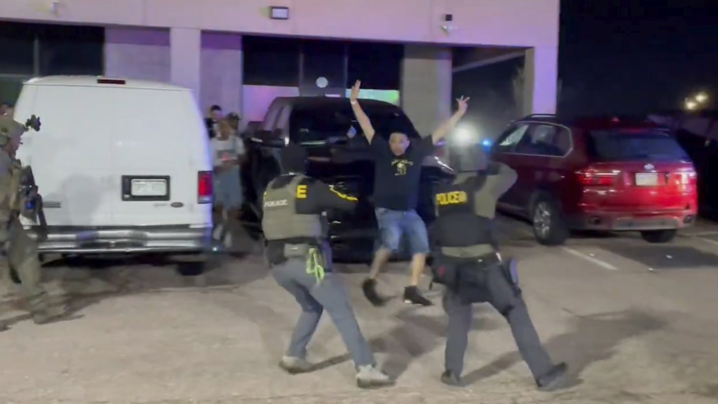 Video posted online by the Drug Enforcement Administration showed agents announcing their presence outside the building and ordering patrons to leave with their hands up. Other videos showed dozens of people fleeing the building through its entrance after federal agents smashed a window. Later, dozens of suspects were shown in handcuffs standing on a sidewalk waiting to be transported.