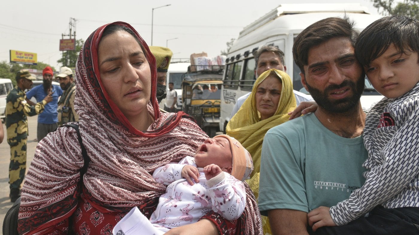 “We have settled our families here. We request the government not to uproot our families,” said Sara Khan, a Pakistani who was ordered back without her husband, Aurangzeb Khan, who holds an Indian passport. She carried her 14-day-old child and said she had been living in Indian-controlled Kashmir since 2017.
