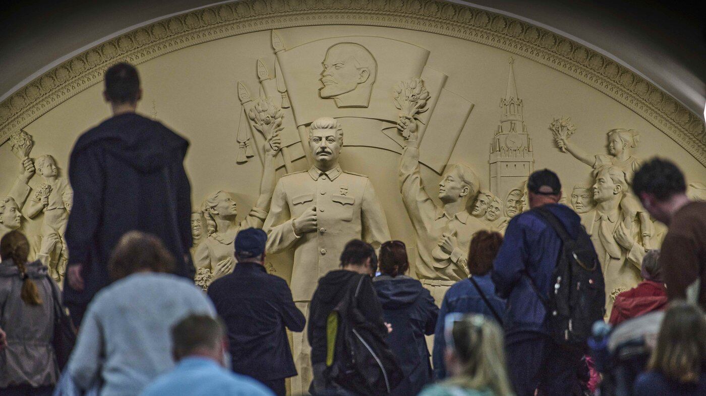 The sculpture shows Stalin surrounded by beaming workers and children with flowers. It was installed at the Taganskaya station to mark the 90th anniversary of the Moscow Metro, the sprawling subway known for its mosaics, chandeliers and other ornate decorations that was built under Stalin.