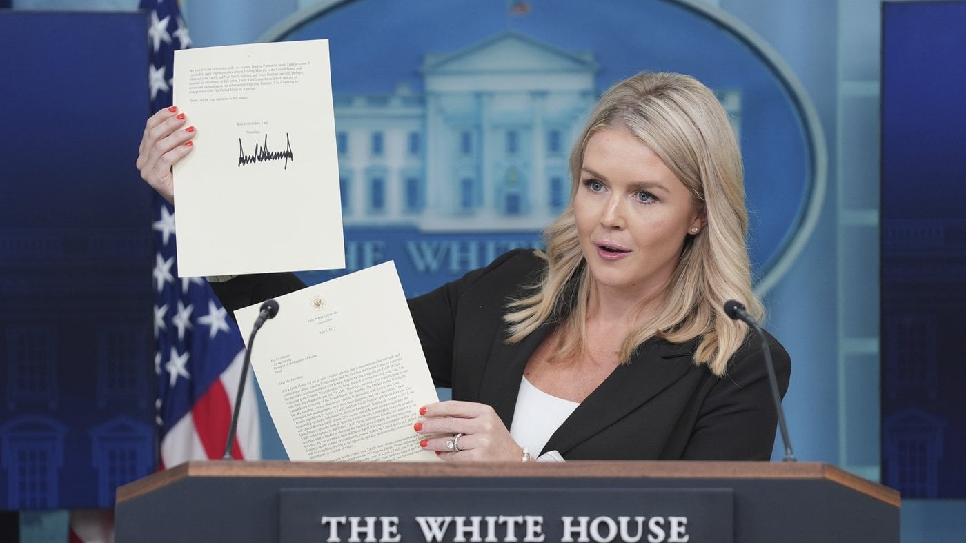White House press secretary Karoline Leavitt speaks as she holds up a letter from President Donald Trump to South Korea's President Lee Jae-myung during a press briefing at the White House, Monday, July 7, 2025, in Washington. (AP Photo/Evan Vucci)