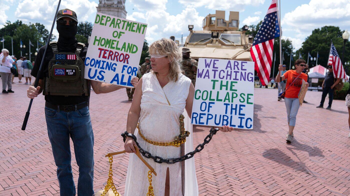 In Washington, a large crowd gathered with signs saying “Stop the ICE invasion” and an umbrella painted with “Free D.C. No masked thugs.” Hundreds more gathered at protests along the West Coast to fight for the rights of immigrants and workers.