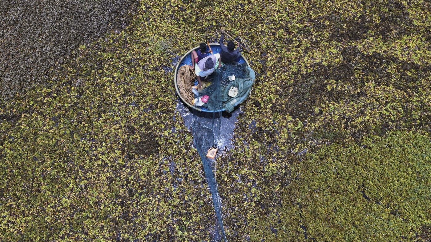 BENGALURU, India — Sunil Kumar rowed his small boat, moving a few feet at a time, while he spread a fishing net across the weeds floating like a green carpet on Doddajala Lake. The ends of the net were then carried ashore and tied to a tractor and an earthmover, which pulled the bundled plants toward laborers ready to drag them out with pitchforks.