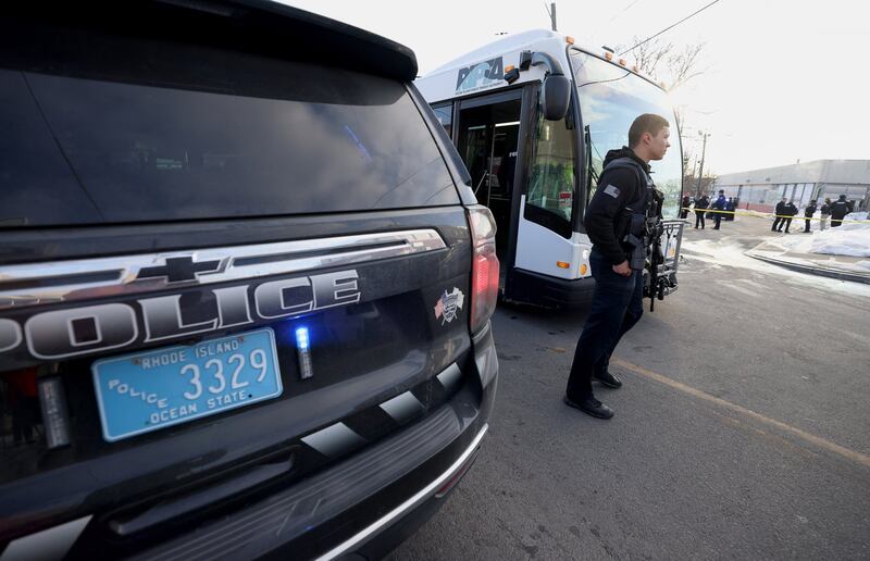 A police officer stands in front of a public transit bus that was used to bus hockey players away from the Lynch Arena in Pawtucket, R.I., after a shooting at the ice rink, Monday, Feb. 16, 2026. (AP Photo/Mark Stockwell) A police officer stands in front of a public transit bus that was used to bus hockey players away from the Lynch Arena in Pawtucket, R.I., after a shooting at the ice rink, Monday, Feb. 16, 2026. (AP Photo/Mark Stockwell)