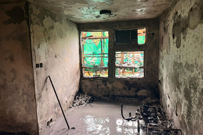 The ceiling of the apartment where he and his wife lived for over 40 years and raised their children was burned so badly that steel rebar was visible. The floor was littered with broken tiles and parts of the apartment needed reinforcement to prevent collapse.