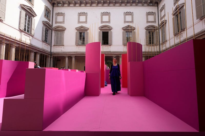 In the courtyard of the historic Palazzo Litta, in the heart of the city, Paris-based Lebanese Lina Ghotmeh created a bright pink, wooden labyrinth meant to induce visitors to slow down, browse design books, take a seat and chat.