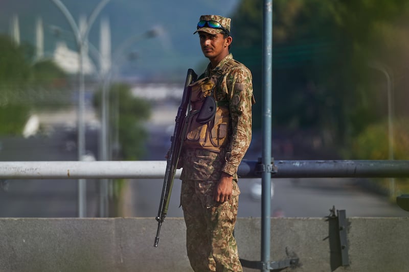 Pakistan US Iran An Army soldier stands guard on an overhead bridge to ensure security for the U.S. and Iran talks, in Islamabad, Pakistan, Saturday, April 25, 2026. (AP Photo/Anjum Naveed)