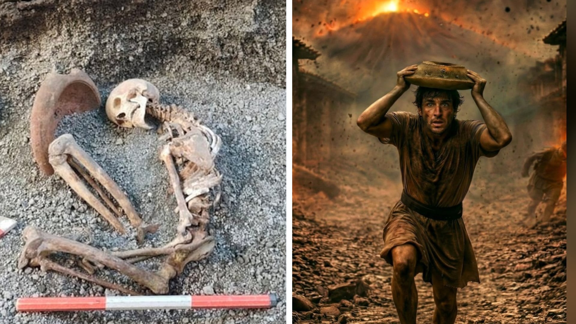 The AI-generated image, released by the Pompeii Archeological Park on Monday, shows a man ducking for cover while holding a large bowl over his head, with a flaming Mount Vesuvius in the background.