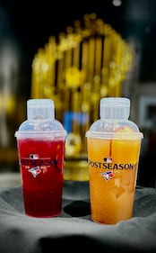 Two specialty cocktails, named October Rally, a bold fall-inspired mix of local cider and whiskey and the Want It All, a vibrant red drink with a lighter, floral flavour. Both are served in a Blue Jays souvenir shaker cup. (Toronto Blue Jays Baseball Club/photo)