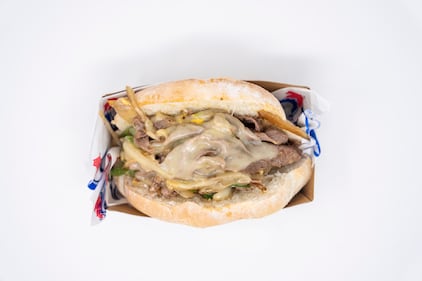 Blue Jays cheesesteak, located at Stand 103: bell peppers & onions | shaved Canadian | ribeye | cheddar sauce | Portuguese roll