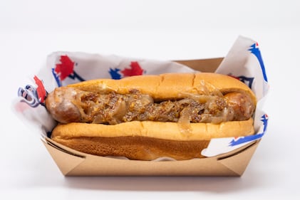 Grilled wild board sausage, located at the Heinz Club: triple crunch mustard | caramelized onions | maple-ale glaze | brioche roll