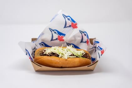 BBQ brisket dog (available for a limited time), located at Stands 240 and 537: all-beef frank | smoked brisket | BBQ sauce | pickles | creamy slaw | brioche roll (Andrew Lahodynskyj/Toronto Blue Jays Baseball Club)