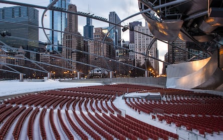 The Jay Pritzker Pavilion, an outdoor entertainment complex in Millennium Park designed by Frank Gehry, is coated in ice and snow on March 2, 2015 in Chicago, Ill. (George Rose/Getty Images)