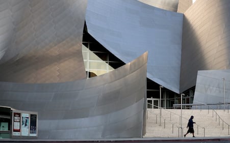 A pedestrian walks past the Walt Disney Concert Hall, designed by Frank Gehry, on March 20, 2020 in Los Angeles, Calif. (Mario Tama/Getty Images)