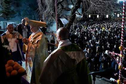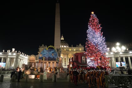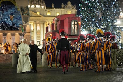 Pope Leo XIV leaves after a moment of prayer in front of the nativity scene that adorns St.Peter's Square at the Vatican, Wednesday, Dec. 31, 2025. (AP Photo/Andrew Medichini)