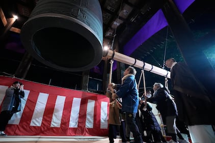 People strike a giant bell to celebrate the New Year at the Zojoji Buddhist temple, minutes after midnight Thursday Jan. 1, 2026, in Tokyo. (AP Photo/Eugene Hoshiko)