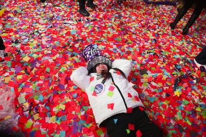 Sora Honda lays on the confetti-covered sidewalk as she celebrates the start of 2026 during New Year's Eve festivities, Thursday, Jan. 1, 2026, in New York. (AP Photo/Heather Khalifa)