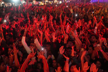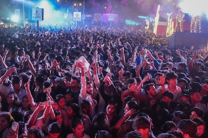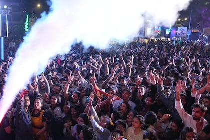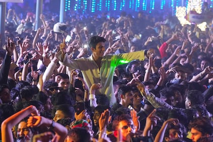People celebrate New Year's eve at a promenade in Mumbai, India, Tuesday, Dec. 31, 2025. (AP Photo/Rafiq Maqbool)