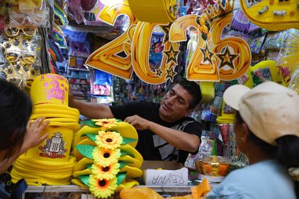 A vendor sells New Year's eve party goods at a market in downtown Lima, Peru, Tuesday, Dec. 30, 2025. (AP Photo/Guadalupe Pardo)