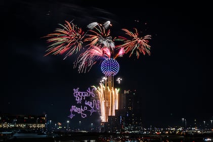 Fireworks and drone show at Reunion Tower are viewed from downtown Dallas for New Year's Eve, Thursday, Jan. 1, 2026, Dallas. (AP Photo/Jessica Tobias)