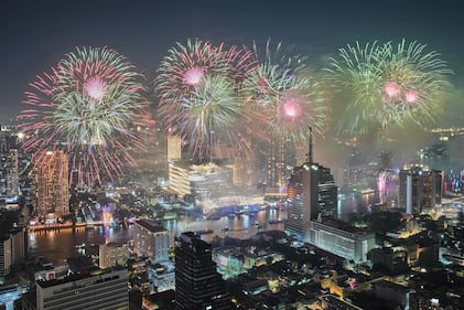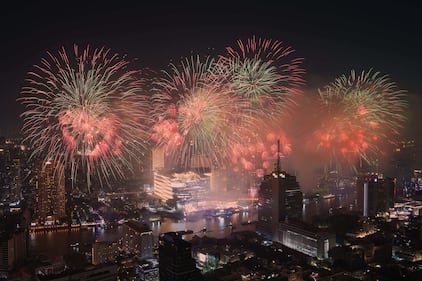 Fireworks explode over the Chao Phraya River during New Year celebrations in Bangkok, Thailand, Thursday, Jan. 1, 2026. (AP Photo/Sakchai Lalit)