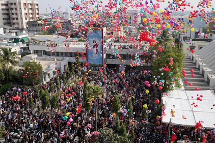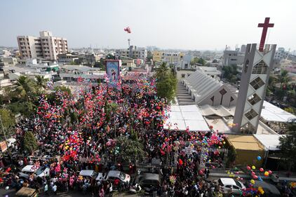 Indian Christians release balloons to celebrate the New Year after offering prayers at a Church in Ahmedabad, India, Thursday, Jan. 1, 2026. (AP Photo/Ajit Solanki)