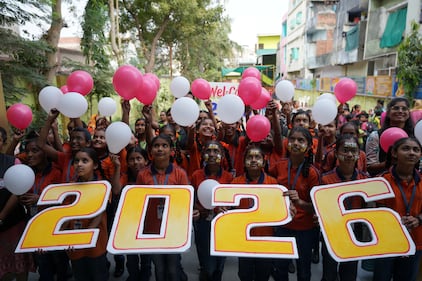 Schoolchildren cheer as they welcome New Year at a school in Ahmedabad, India, Thursday, Jan. 1, 2026. (AP Photo/Ajit Solanki)