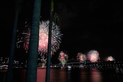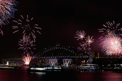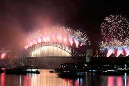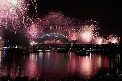 Fireworks burst over the Sydney Harbour Bridge as New Year's celebrations begin in Sydney, Wednesday, Dec. 31, 2025. (AP Photo/Rick Rycroft)