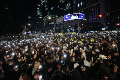 People gather before the New Year's countdown event in front of the Bosingak pavilion where the annual New Year's bell-ringing ceremony is held in Seoul, South Korea, Wednesday, Dec. 31, 2025. (AP Photo/Lee Jin-man)