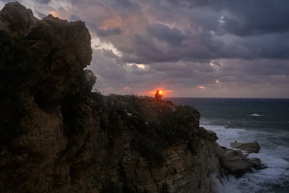 A man sits on a cliff as the last sunset of 2025 is seen over the Mediterranean Sea in Beirut, Lebanon, Wednesday, Dec. 31, 2025. (AP Photo/Hassan Ammar)