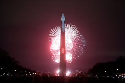 The Washington Monument is illuminated as a candle as part of the 250th anniversary celebration for the United States, Wednesday, Dec. 31, 2025, in Washington. (AP Photo/Rahmat Gul)
