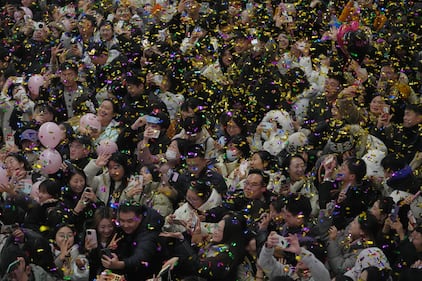 Reveler showered by confetti as they celebrate the start of 2026 during the New Year countdown event held at a shopping mall, in Beijing, early Thursday, Jan. 1, 2026. (AP Photo/Andy Wong)
