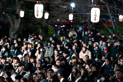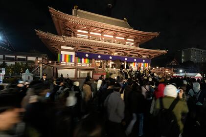 People gather to celebrate the New Year at the Zojoji Buddhist temple on Wednesday, Dec. 31, 2025 in Tokyo. (AP Photo/Eugene Hoshiko)