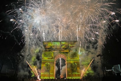 A light show is projected on the Arc de Triomphe as fireworks explode during New Year celebrations on the Champs Elysees, in Paris, France, Thursday, Jan. 1, 2026. (AP Photo/Christophe Ena)