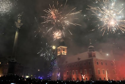 Fireworks light the sky above the Royal Castle during New Year's celebrations shortly after midnight in Warsaw, Poland, Thursday, Jan. 1, 2026. (AP Photo/Czarek Sokolowski)